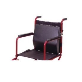 Lumber cushion with buckle straps to attach to wheelchair. Masonite insert prevents cushion sling.